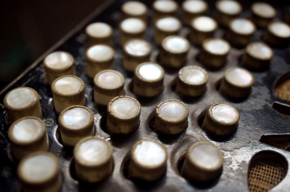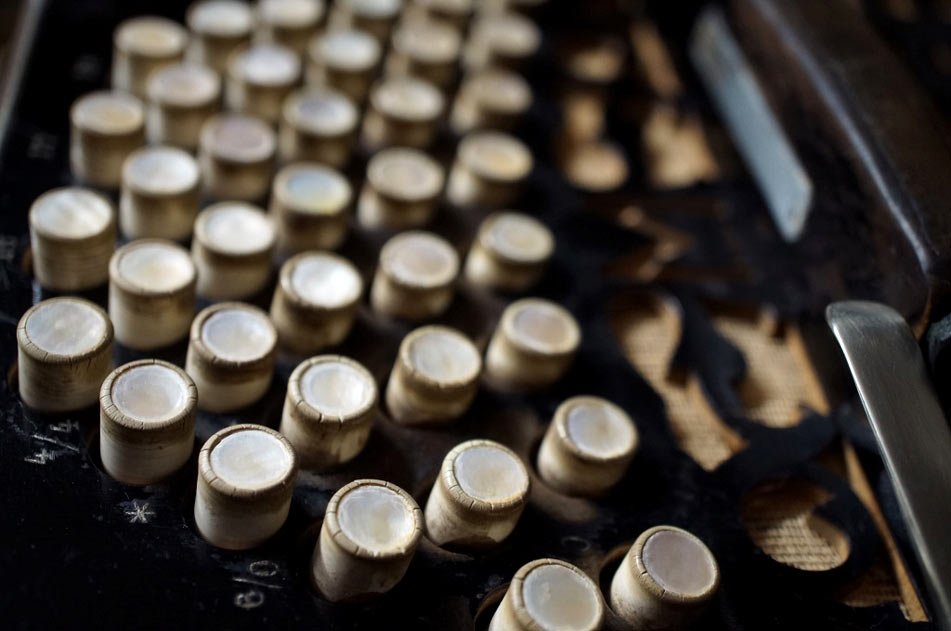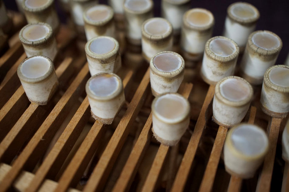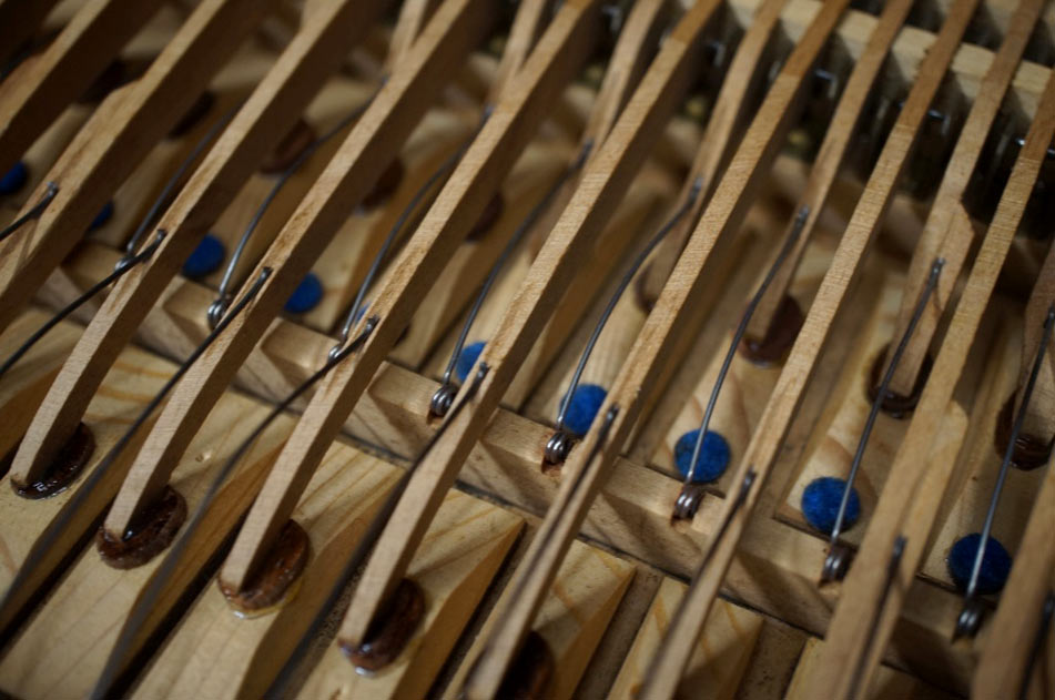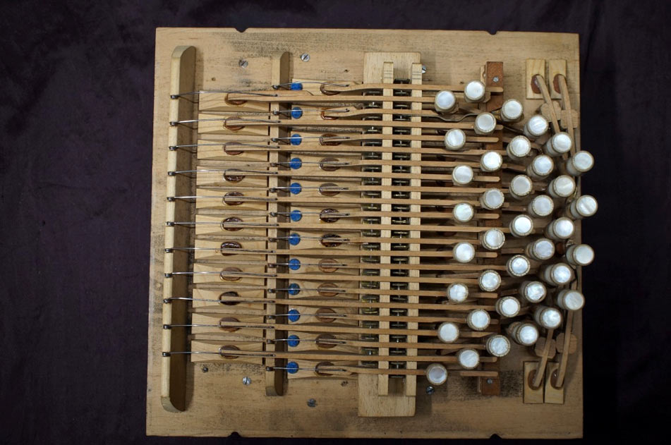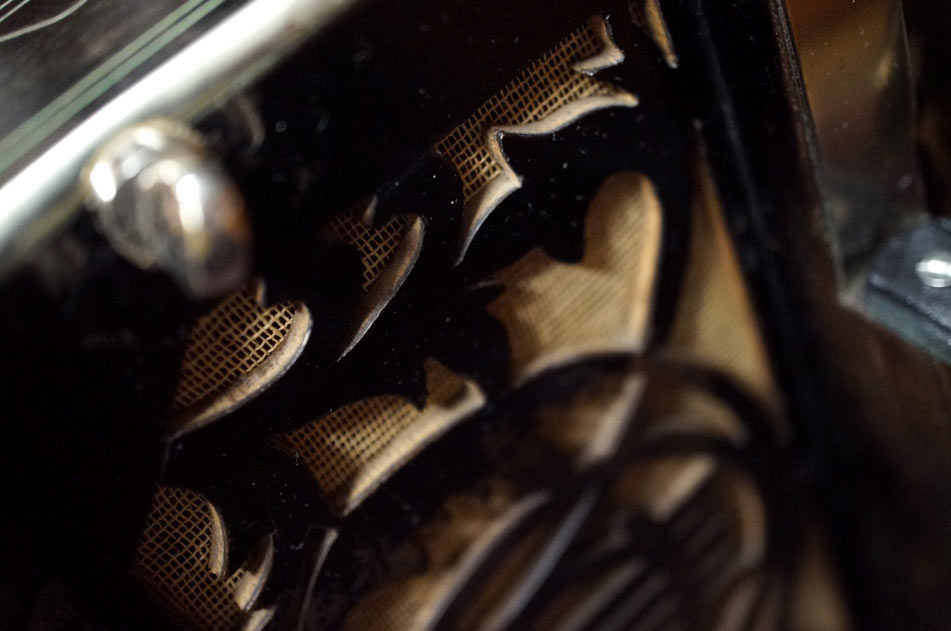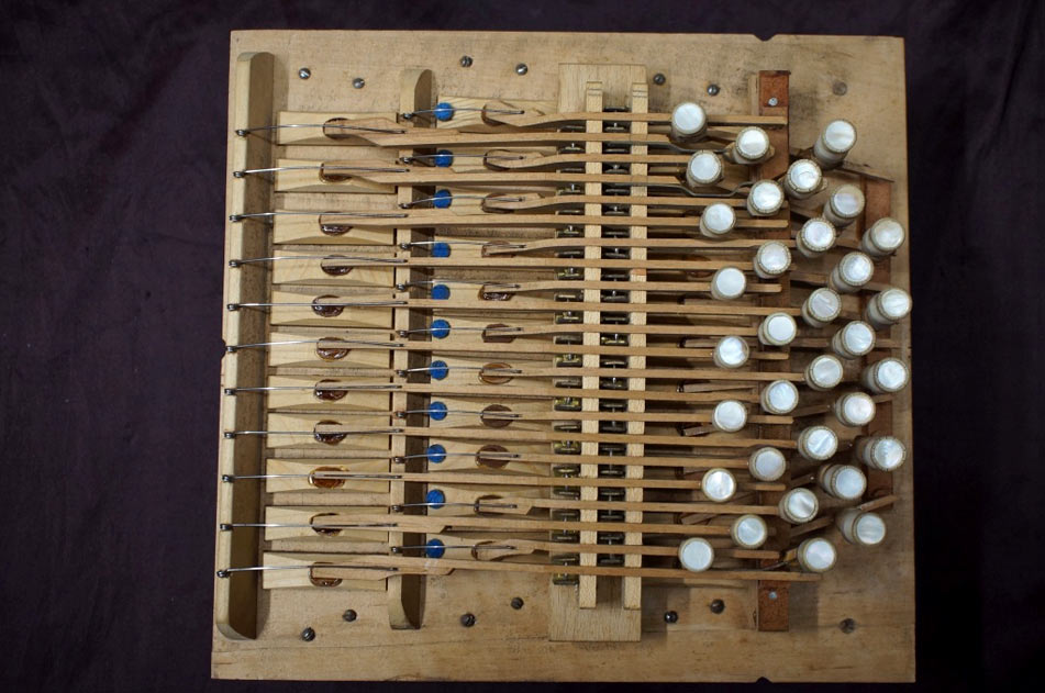 Another special feature distinguishes all bandoneons by ELA: the outer mechanism levers have a “reinforcement,” which is actually a widening of the mechanism. This widening is necessary because the reed plates on this model are wider than usual. Wider plates have more space between the pairs of reeds and thus more space in the wind-conducting chambers. The usual narrowness with a valve and a vibrating reed in each chamber is more relaxed here, especially in the left hand.