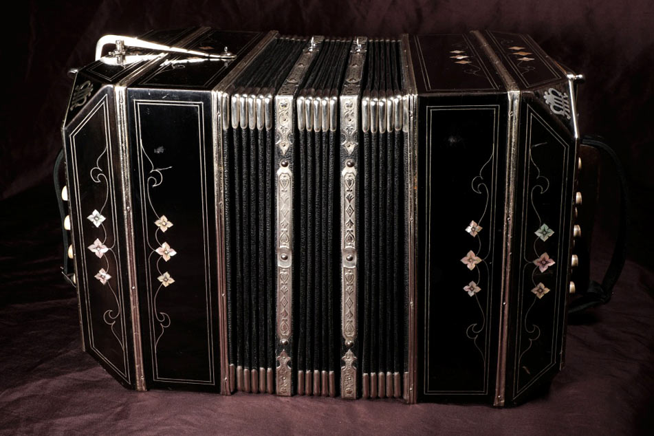 Ein klassisches Bandoneon von Ernst L. Arnold Carlsfeld. Es ist ein für ELA spätes Modell vermutlich aus der ersten Hälflte der 1930er-Jahre. Leider läßt es sich nicht exakt bestimmen. Es ist jedoch ein typisches Modell dieser späten Epoche, bei der ELA wieder zum Material Zink in der Produktion der Stimmplatten zurückgefunden hat.