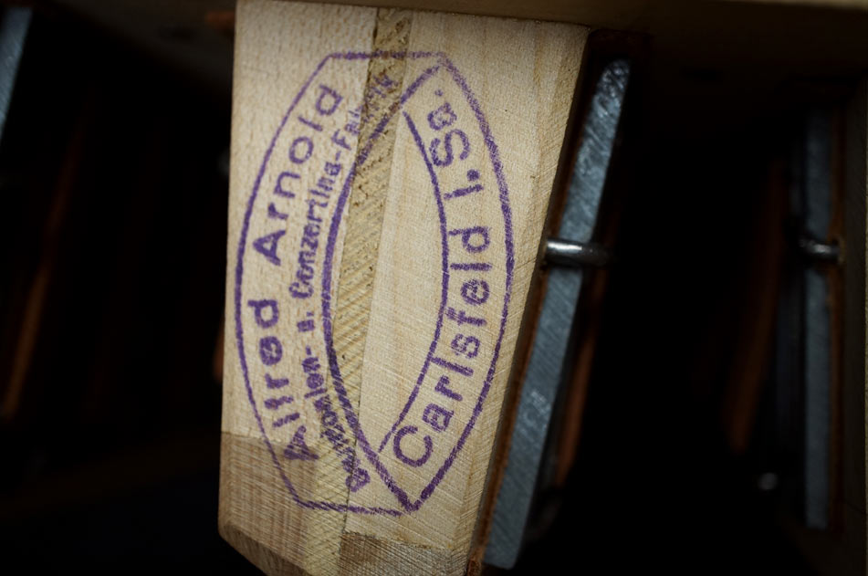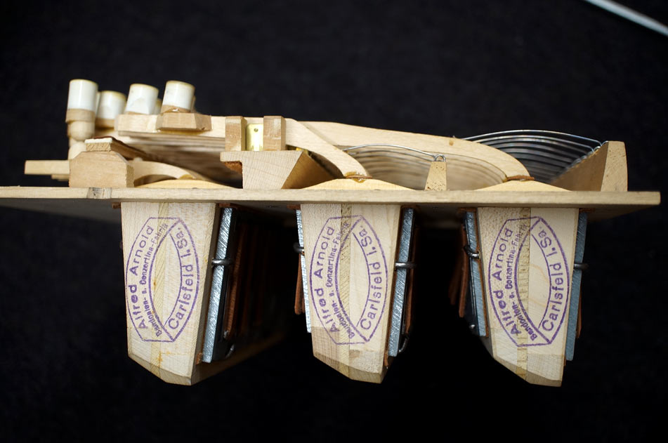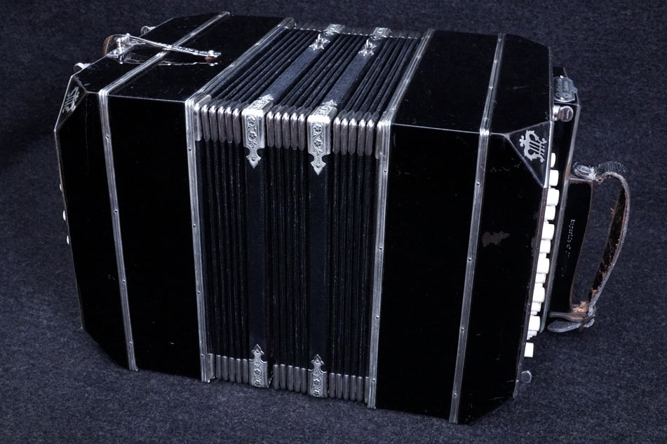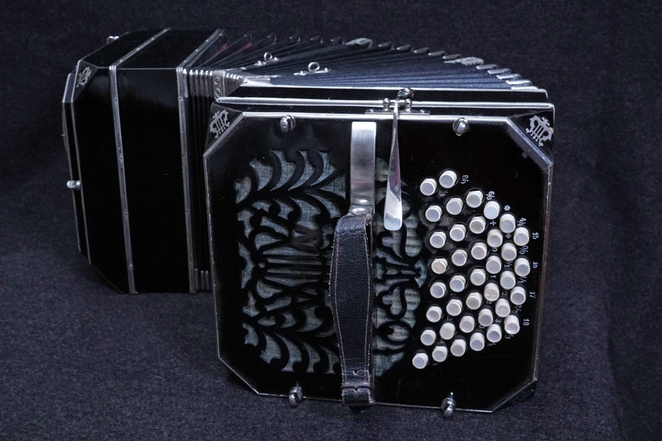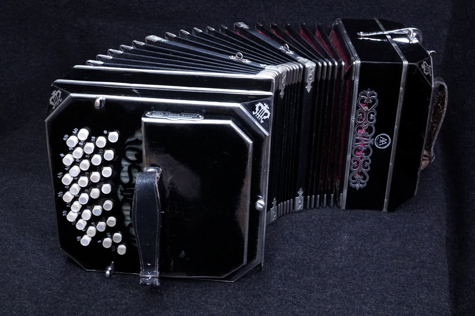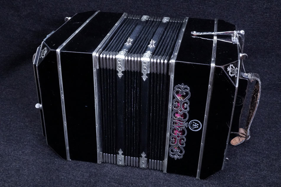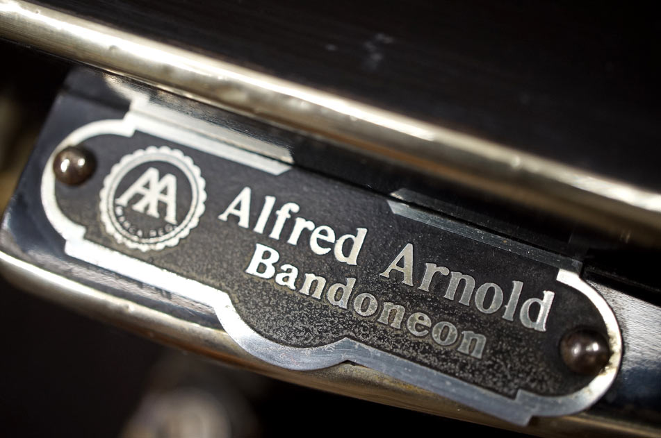 Ein gleichtöniges Bandoneon in der Anlage Péguri / gegenparallel. Das Instrument wurde von Alfred Arnold im Jahre 1939 gebaut. Es überdauerte die Jahrzehnte ungespielt und ungestimmt in der Schweiz. Das Instrument erscheint vollkommen unberührt und ist komplett original bis in das Detail. Es besitzt handgefertigte Zungen (a mano). Klanglich erscheint das Instrument überdurchschnittlich kraftvoll.