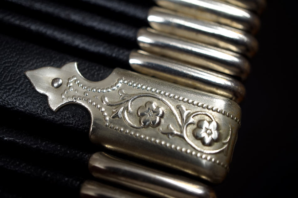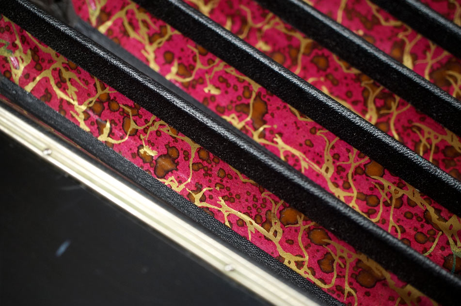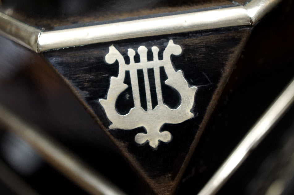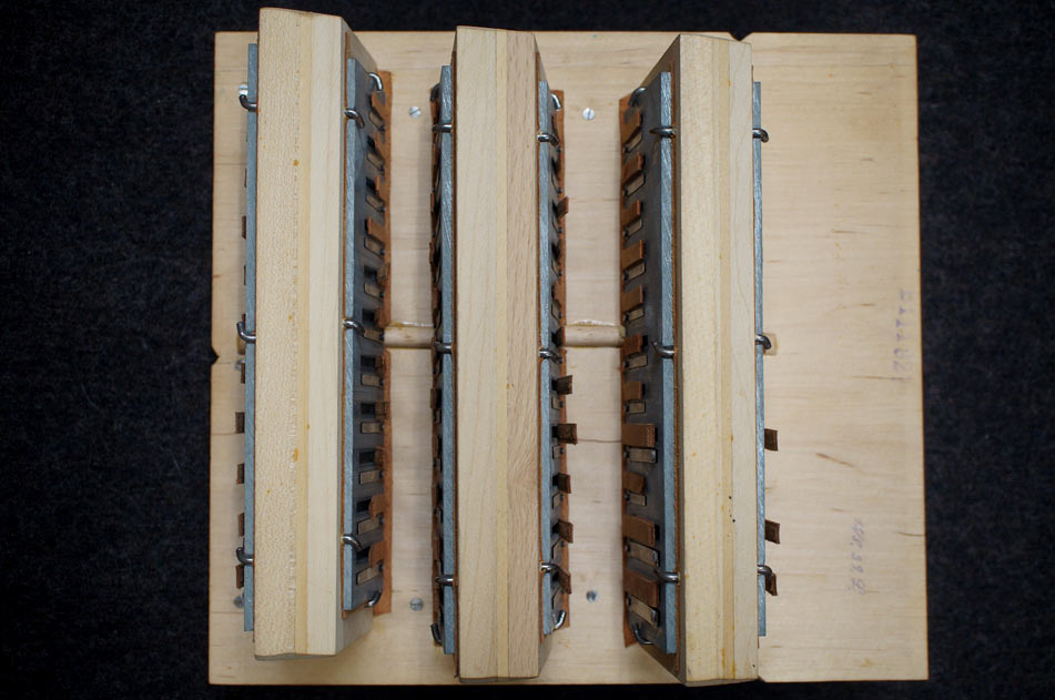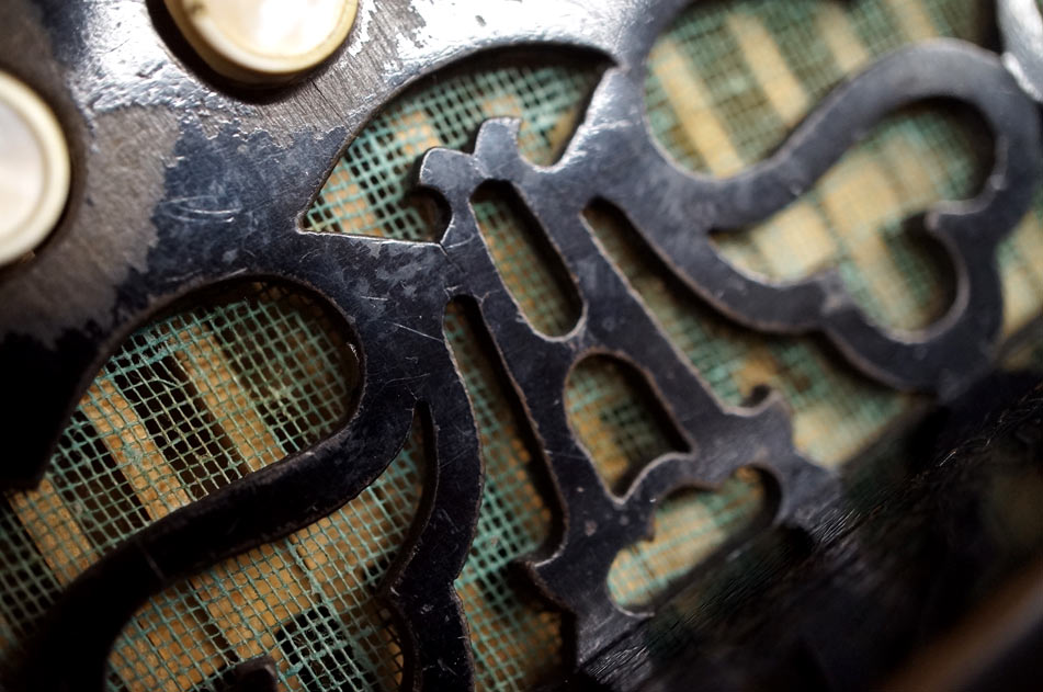 This Bandoneon has the very rare counter-parallel system. In the B system (accordion), unlike the C system, you have the low notes on the lower side of the keyboard. The difference between the two systems is that on the first row of keys of the C system you can find the keys c, d sharp, f sharp, a, while on the first row of the B system you can find the keys d, f, g, h. The B system has the keys c, d sharp, f sharp, a, while on the first row of the B system you can find the keys d, f, g, h.