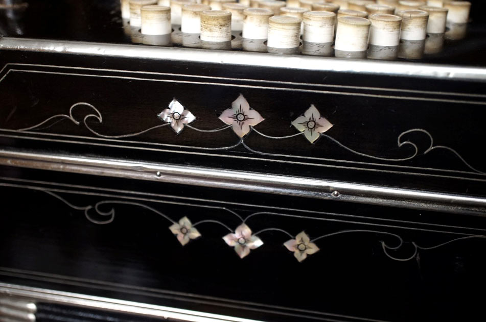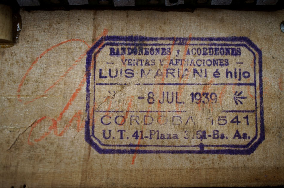 The letter “M” carved into the two covers led to the assumption that this was a bandoneon made by the Mariani company in Buenos Aires. Mariani produced a small number of bandoneons in Buenos Aires, also with a stylized “M” carved into the covers. However, I consider this to be unlikely in this case. It is a typical ELA with all the details of the traditional brand. Since ELA also produced for Hohner and Hohner specially marked its (ELA) bandoneons, I suspect that the “M” stands for Matthias Hohner. We may never know for sure.