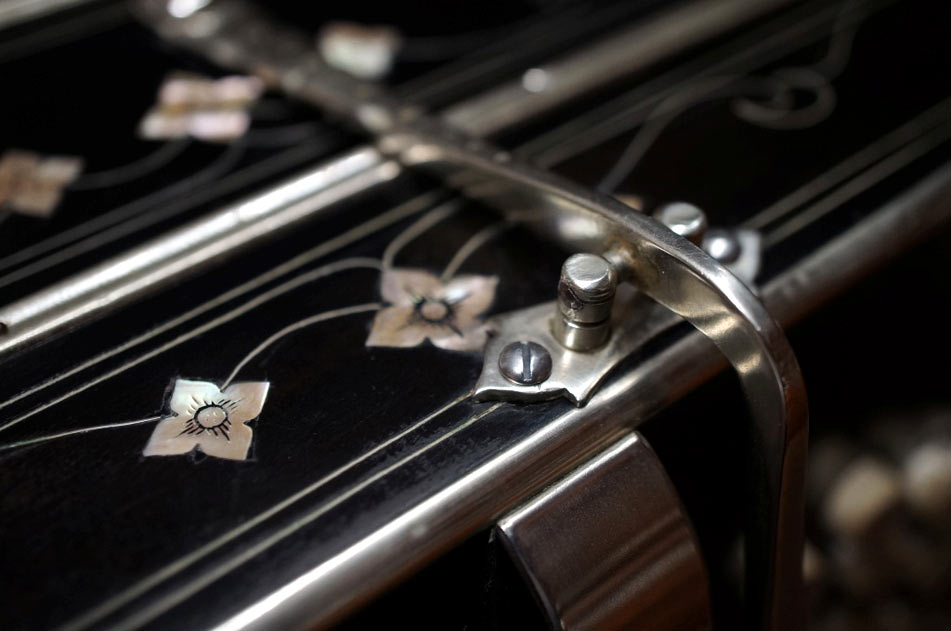 Another special feature distinguishes all bandoneons by ELA: the outer mechanism levers have a “reinforcement,” which is actually a widening of the mechanism. This widening is necessary because the reed plates on this model are wider than usual. Wider plates have more space between the pairs of reeds and thus more space in the wind-conducting chambers. The usual narrowness with a valve and a vibrating reed in each chamber is more relaxed here, especially in the left hand.