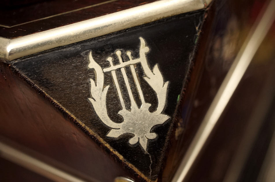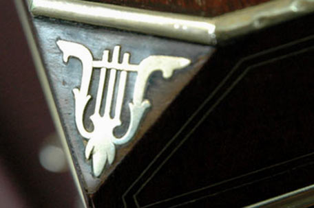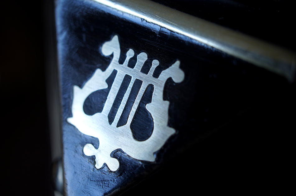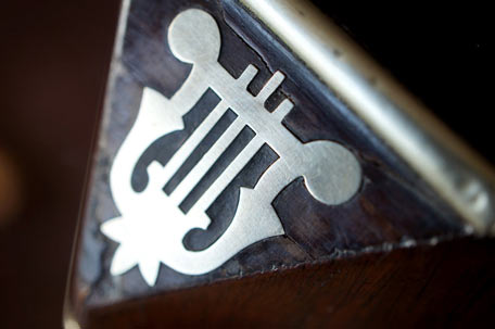 Klassisches AA mit zwei stilisierten A neben einer dreisaitigen Lyra. Diese Aussägearbeit im Deckel der rechten Hand findet man ab ca. 1932 parallel zu der klassischen mit Ranken neben einer fünfsaitigen Lyra (siehe oben). Das ausgesägte A vor dem Griff ist bei beiden Gestaltungen gleich.