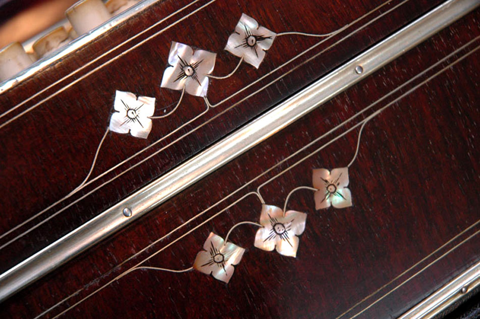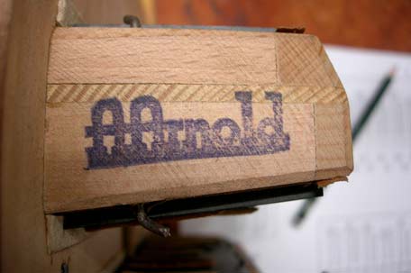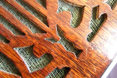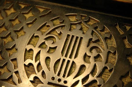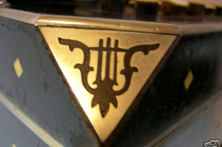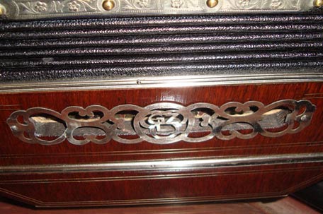 Classic design on an Alfred Arnold Bandoneon. This design in the lid of the right hand was used until shortly before the end of the pre-wr. production. Even with the introduction of the new design of the sawing work with two stylized A, probably from 1932 (see below), the classic design was maintained in parallel. |