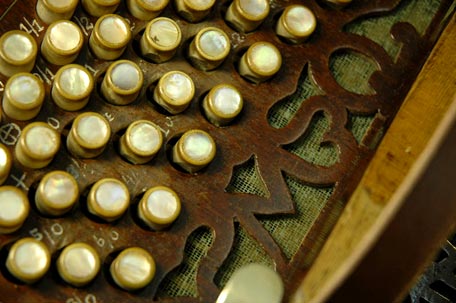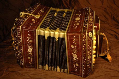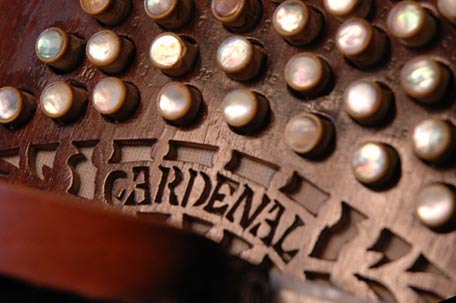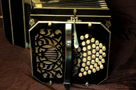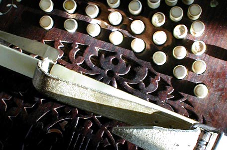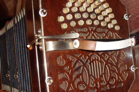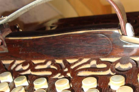 With one exception, ELA Bandoneons always have this floral design between the handle and the keyboard. The stylized rose is typical. The exception is the ELA Cardenal (see below). |