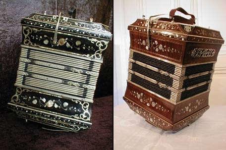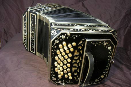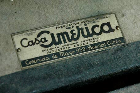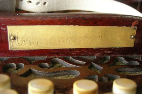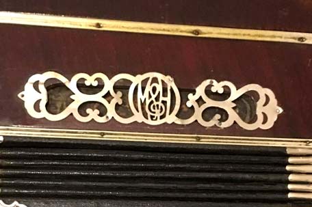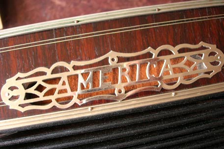 Die Raute mit Bogen (statt "A") in den Aussägearbeiten in den Deckeln zwischen Griff und Tastatur habe ich auch bei AA- Instrumenten gesehen, die von "Casa America" in Buenos Aires / Argentinien importiert wurden. Auch hier fehlt eine Dokumentation oder eine verläßliche Quelle. Man kann leider nur anhand von Indizien vermuten.