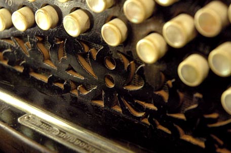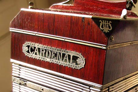 ELA provided its instruments with a number of different model names. So there were the models Cardenal, Germania, America, Echo, Tango and more. In the technical sense, the models did not differ fundamentally from one another. The difference was mostly only in the beautifully designed metal plate above the air flap opening. The exception is the sawing work on the "Cardenal" model between the handle and the keyboard (see right). |