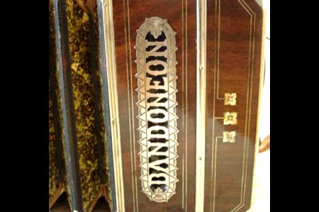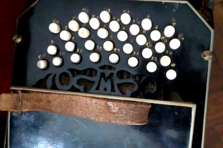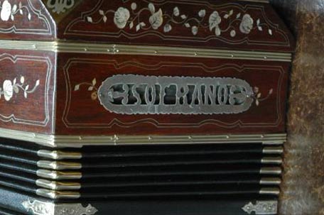 Docorative plate of an ELA bandoneon. Since the abbreviation "ELA" can be seen twice, these models are often called "ELA-ELA" in Argentina. |