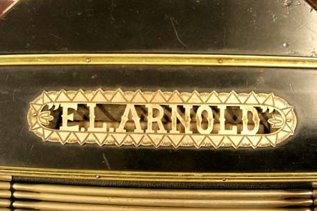 The typical Alfred Arnold "A" or lettering "Premier", stylized in the sawing out of the lids in front of the handles, is designed differently on rare instruments. It is a rhombus sawn out over an arch. The design of the lids of the otherwise identical AA instruments was produced in this way for the importers "Palacio de le Musica" (Campo) in Montevideo / Uruguay and "Casa America" in Buenos Aires. |