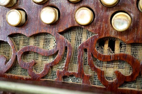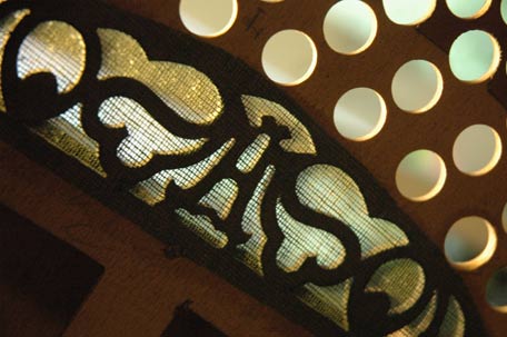 Klassische Aussägearbeit an einem Alfred Arnold Bandoneon. Diese Gestaltung im Deckel der rechten Hand wurde bis kurz vor Ende der Produktion des Vorkri.-Modelles genutzt. Auch mit Einführung der neuen Gestaltung der Aussägearbeit mit zwei stilisierten A, vermutlich ab 1932 (siehe unten), wurde das klassische Design parallel beibehalten.
