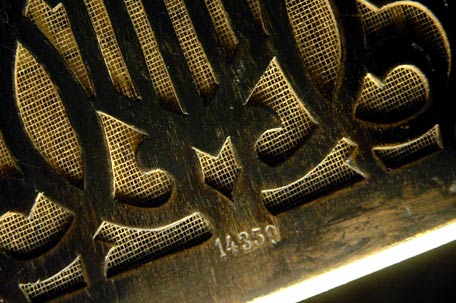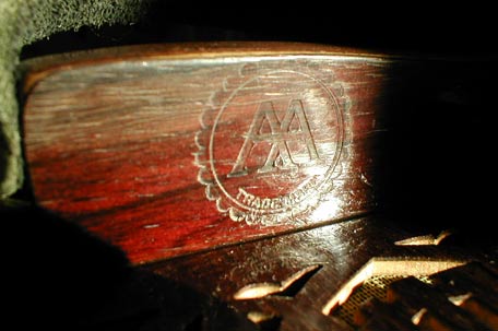 Hier die klassische Aussägearbeit an einem AA mit geprägter, sechsstelliger Nummer. Instrumente mit der anderen Aussägearbeit, der mit den zwei stilisierten A (siehe unten), trägt eine solche Nummer (als Exportmodell) immer. Bei diesem klassischen Design ist sie selten.