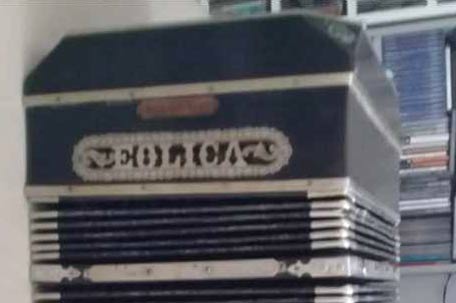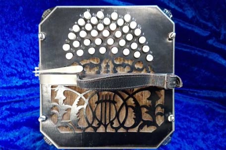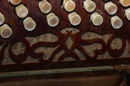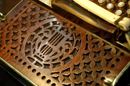 ELA Bandoneon with the typical sawing work with stylized lyre surrounded by a floral pattern in a circle surrounded by 4-pointed stars. Only the holes around the sawing work that are visible here are not always complete or are also missing. Otherwise, ELA always had this typical design. |