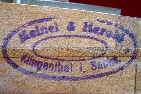 Meinel & Herold, Klingenthal in Sachsen. Stempel an der Kopfseite einer Baßkanzelle ... siehe auch "Originalstempel"