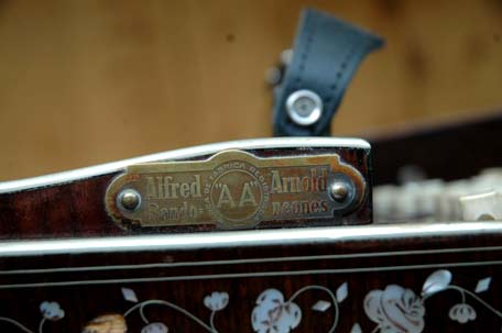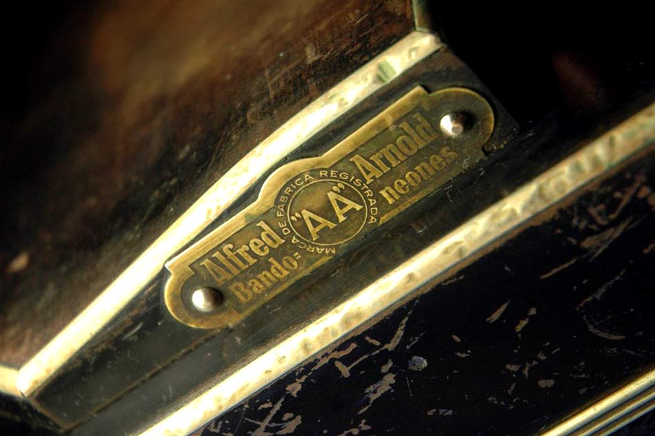 "AA", Alfred Arnold Bandoneones, Marca De Fabrica Registrada. Metallemblem aufgenagelt auf den Brummkaten der linken Hand.