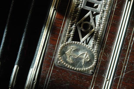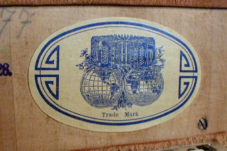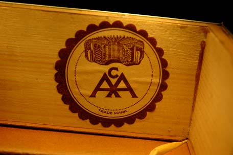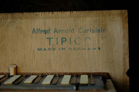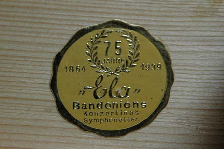 "AA", Alfred Arnold Bandoneones, Marca De Fabrica Registrada. Metal emblem nailed on the baffle of the left hand side. |