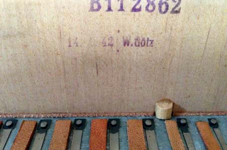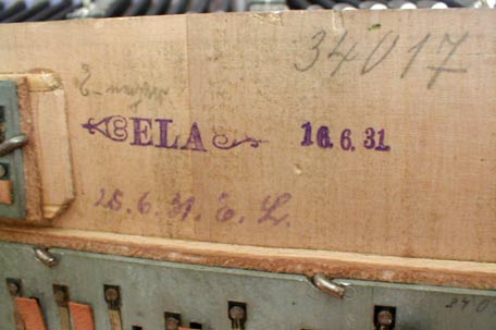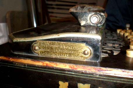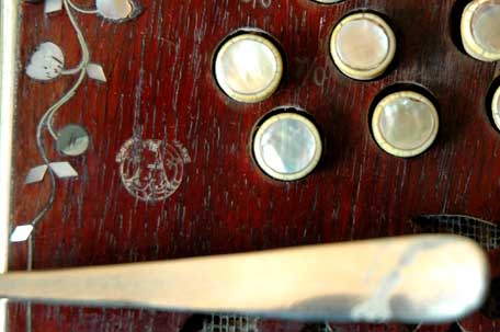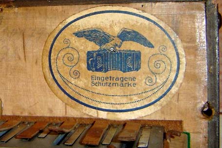 A / Schutzmarke (trademark). Very rare stamp in front of the air lever above the keyboard of the right hand on an early model. |