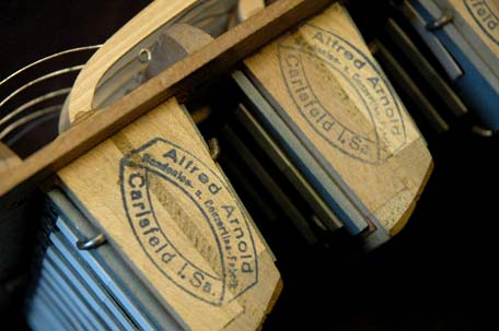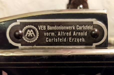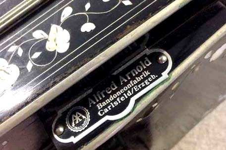 Alfred Arnold, Carlsfeld i.Sa. (Carlsfeld in Sachsen) Bandonion- u. Concertina-Fabrik. Sehr seltener Stempel da erst kurz vor Ende der Serienproduktion in den frühen 40er-Jahren genutzt.