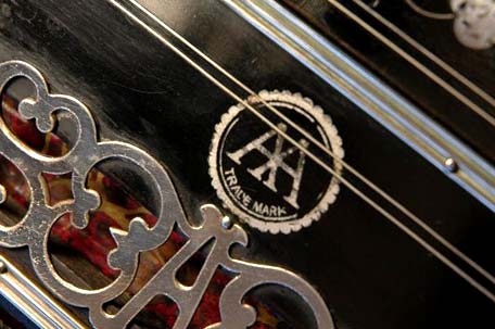 AA / TRADE MARK. Dieser Stempel neben der Luftklappenöffnung haben nicht alle AA-Bandoneons. Er ist meist silbern, bei späteren Modellen auch in goldener Farbe.