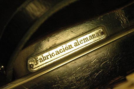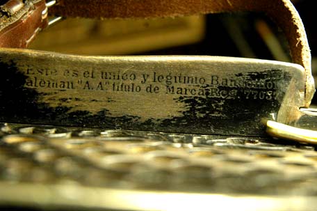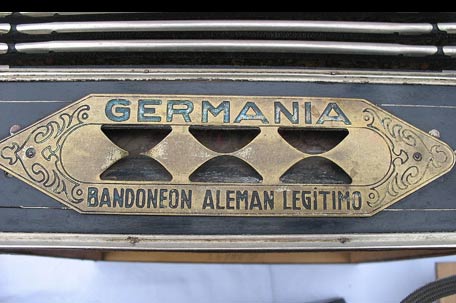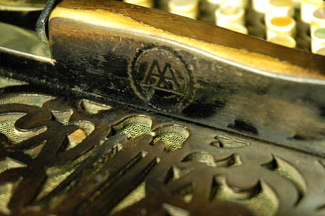Este es el unico y legitimo Bandonion aleman "AA" título de Marca Reg. 77037 (this is the only legitimate german Bandonion "AA" titled with the registered mark 77037). This sentence is stamped on the treble side handle of each export bandoneon with the two A in the sawing work in the cover. If the lid has the classic sawing work with the five-string lyre, the sentence is mostly missing. |