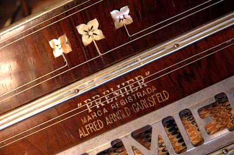 The typical Alfred Arnold "A" or lettering "Premier", stylized in the sawing out of the lids in front of the handles, is designed differently on rare instruments. It is a rhombus sawn out over an arch. The design of the lids of the otherwise identical AA instruments was produced in this way for the importers "Palacio de le Musica" (Campo) in Montevideo / Uruguay and "Casa America" in Buenos Aires ... see also "list of classic models" |