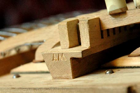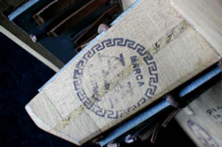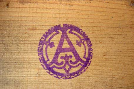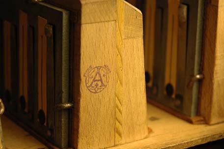 A / Eingetragene Fabrik-Marke an einer Baßkanzelle. Hersteller-stempel an den Kopfseiten der Baßkanzellen finden sich oft, jedoch nicht immer.