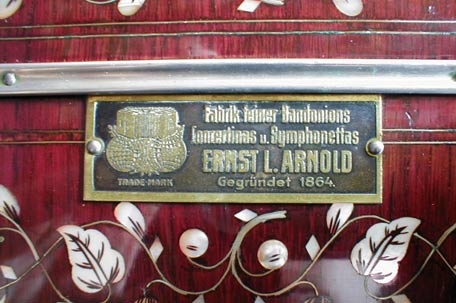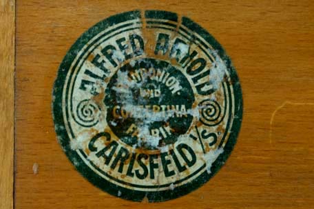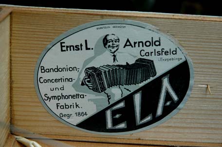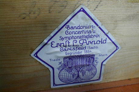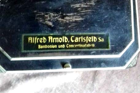 Alfred Arnold, Carlsfeld i.S. (Carlsfeld in Sachsen) Bandonion- und Concertina-Fabrik. Rare paper sticker (with thanks to C. Paas). |